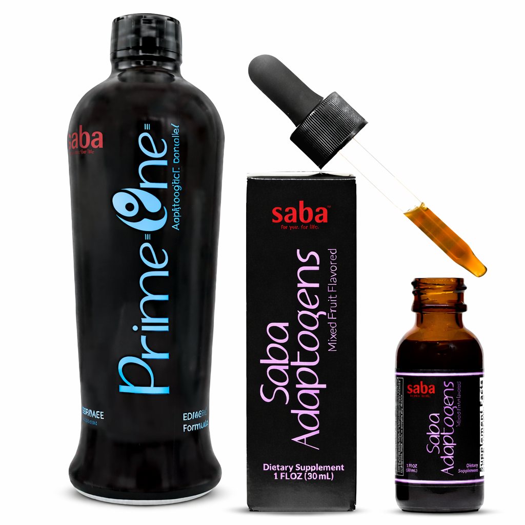 The Saba Prime Adaptogen Daily Kit - combines Saba Prime One™ (Full-Size Liquid Adaptogen) with Saba Adaptogen™ (Concentrated -1 FL Oz with droper) to deliver complete, all-day adaptogenic support—at home and on the go. It’s a daily stress-defense system designed for modern life.